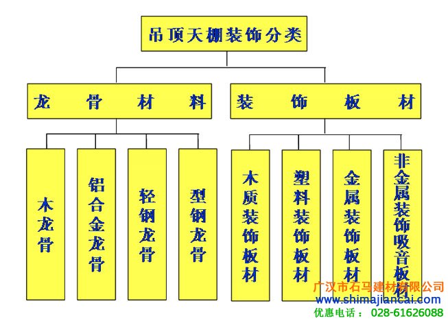 吊頂天棚是利用樓板或屋架等結(jié)構(gòu)為支撐點,吊掛各種龍骨,在龍骨上鑲鋪裝硅酸鈣板或裝飾面層,而形成的裝飾天棚。輕鋼龍骨吊頂天棚一般由輕鋼龍骨和裝飾板材兩部分組成。 按材料不同,龍骨又分為木龍骨、鋁合金龍骨、輕鋼龍骨、型鋼龍骨等,裝飾板材又分為木質(zhì)裝飾板材、塑料裝飾板材、金屬裝飾板材、非金屬裝飾吸音板材等。如下圖所示。